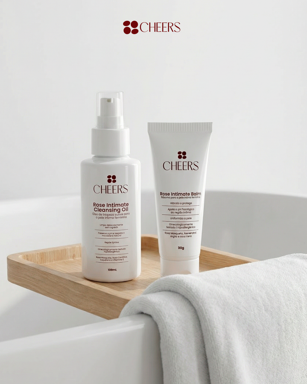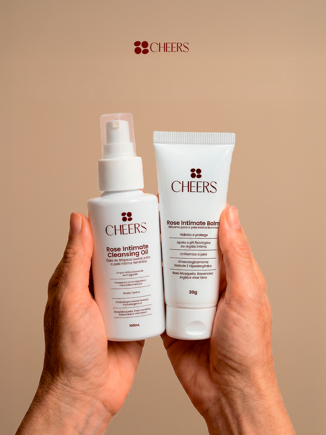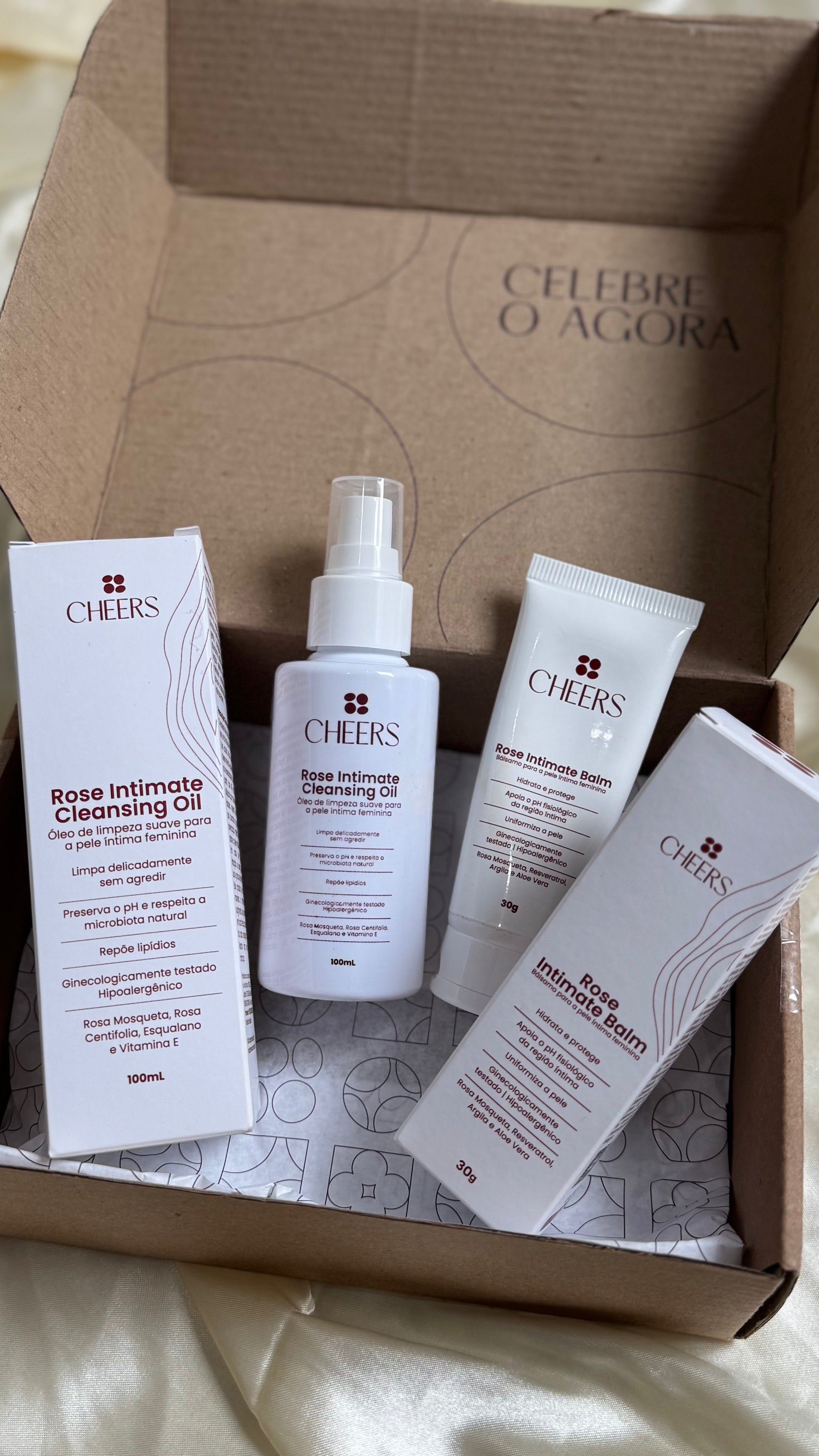 O Kit Rose Intimate reúne os dois primeiros produtos da Cheers em uma rotina completa de autocuidado íntimo para mulheres 40+. Com o Rose Intimate Cleansing Oil, você garante uma limpeza delicada que respeita, de verdade, o pH natural e previne o ressecamento. Já o Rose Intimate Balm hidrata profundamente, devolvendo maciez, frescor e alívio para desconfortos comuns da maturidade.
